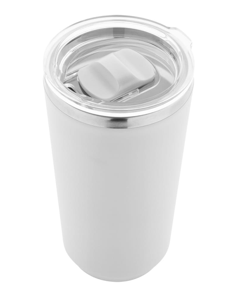 Dvoslojna termo skodelica iz recikliranega nerjavečega jekla s plastičnim pokrovčkom za pitje.