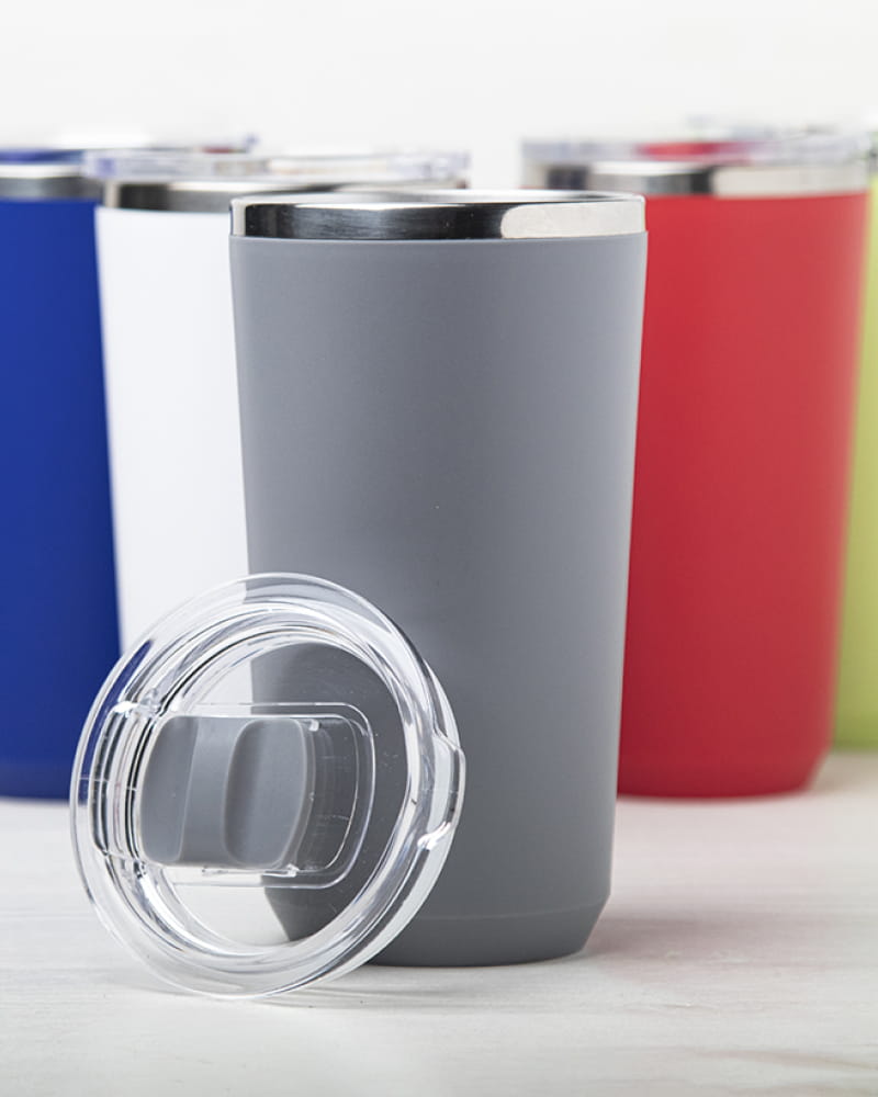 Dvoslojna termo skodelica iz nerjavečega jekla s PP plastično prevleko in pokrovčkom za pitje. 500 ml.