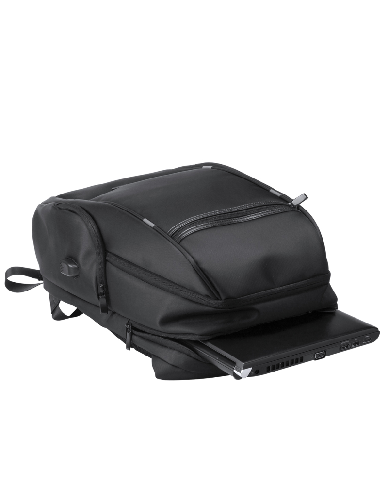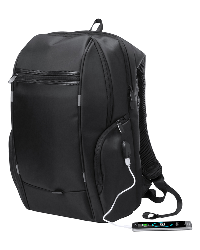 Vodoodporen nahrbtnik iz najlona z več predali z zadrgo, žepom proti kraji, oblazinjenim predalom za prenosnik (15"), hrbtom in naramnicami. Z vgrajeno USB povezavo za power banke.