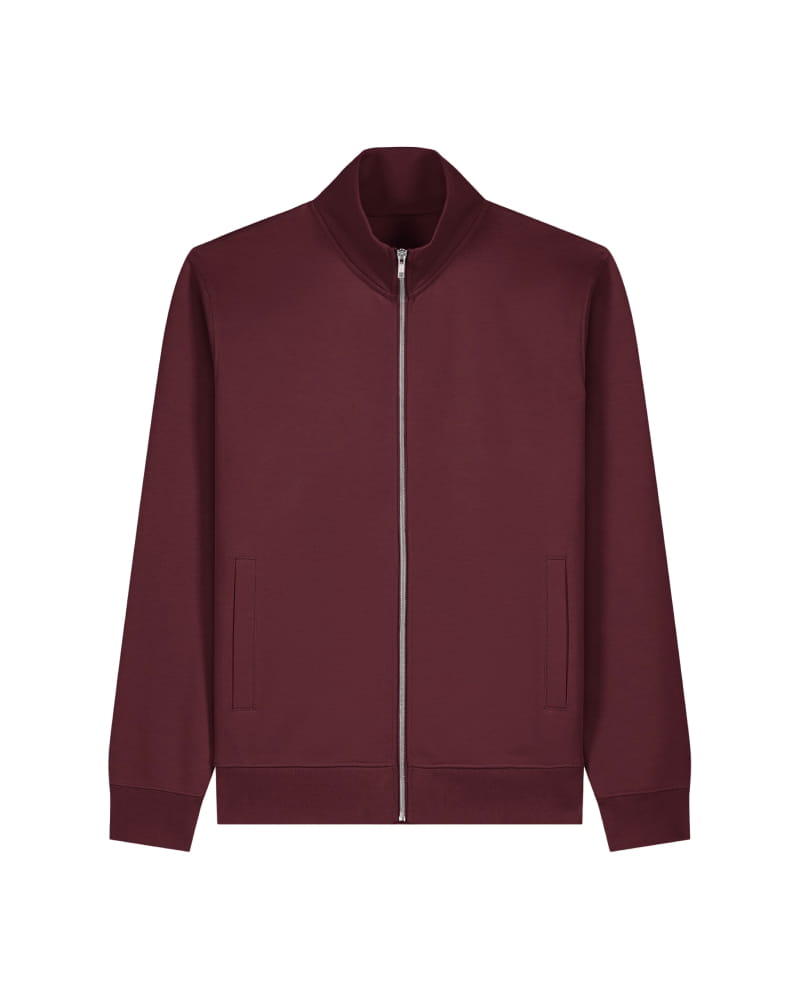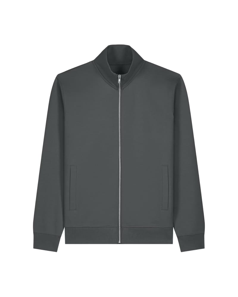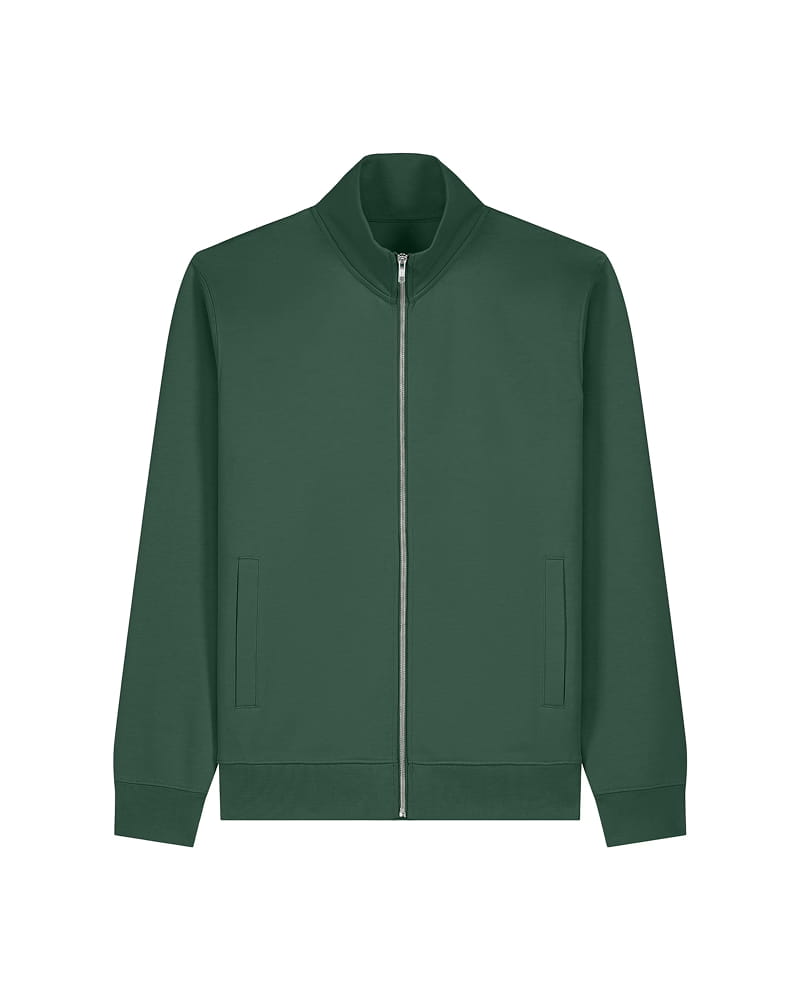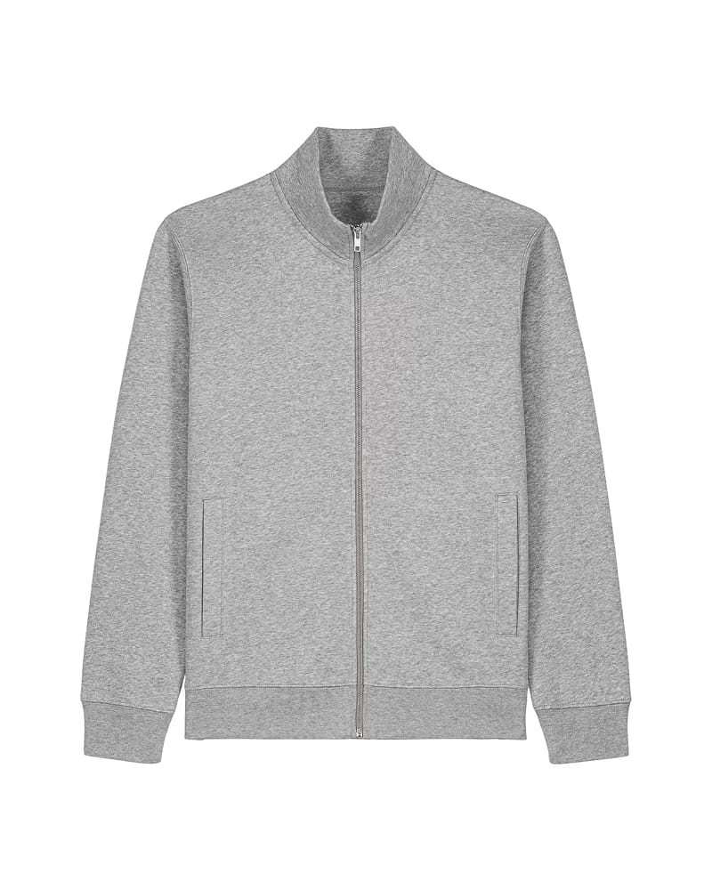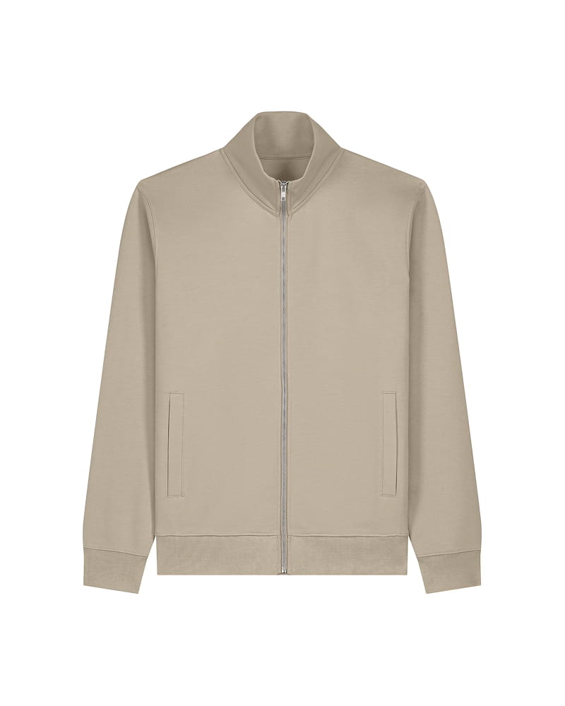 Pulover z višjim mock-neck ovratnikom in kovinsko zadrgo spredaj, izdelan iz mešanice organskega česanega bombaža in recikliranega poliestra z mehko, krtačeno notranjostjo. Ima trak v ribji kosti ter polkrožni všitek na hrbtni strani ovratnika za čistejšo in obstojnejšo izdelavo. Všiti rokavi, paspulirani žepi in 1x1 rebraste manšete ter spodnji rob zagotavljajo strukturiran, urejen videz.