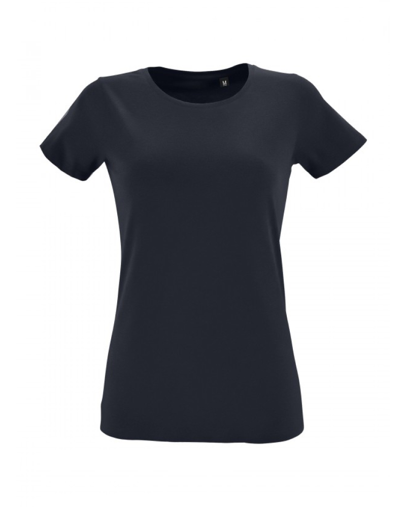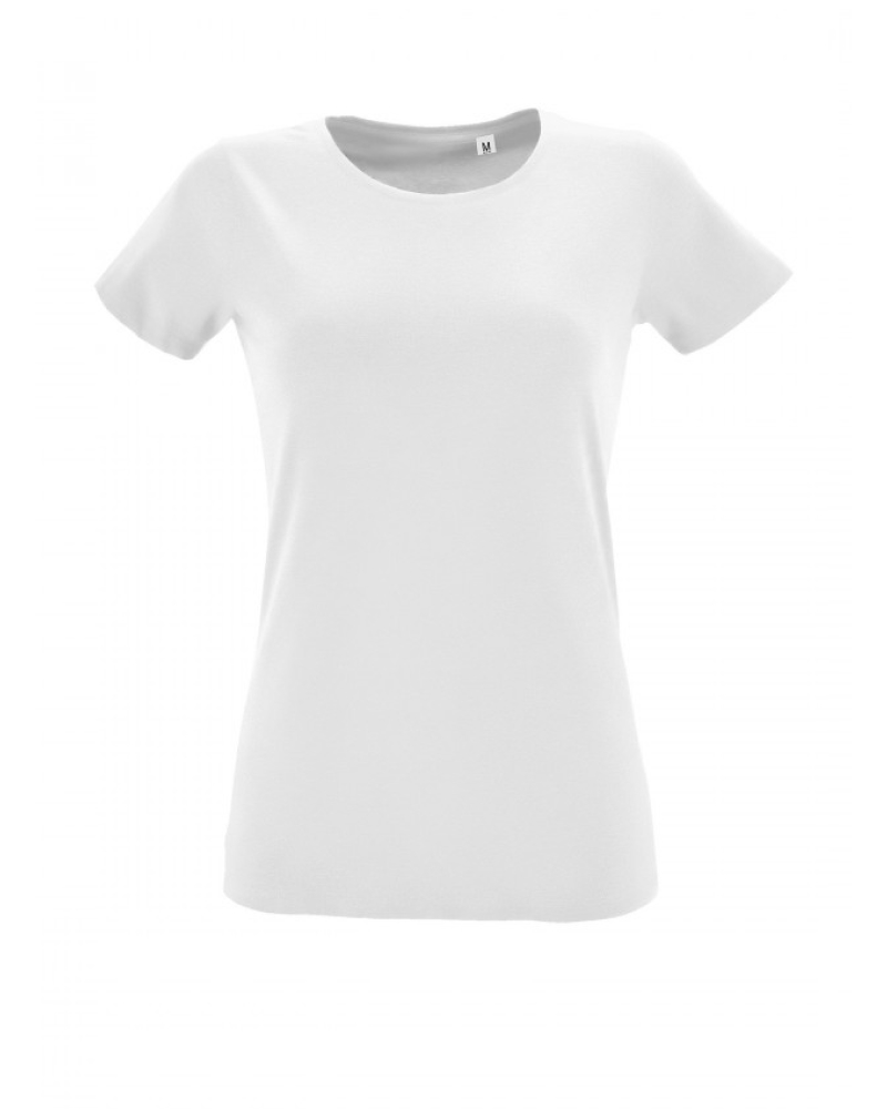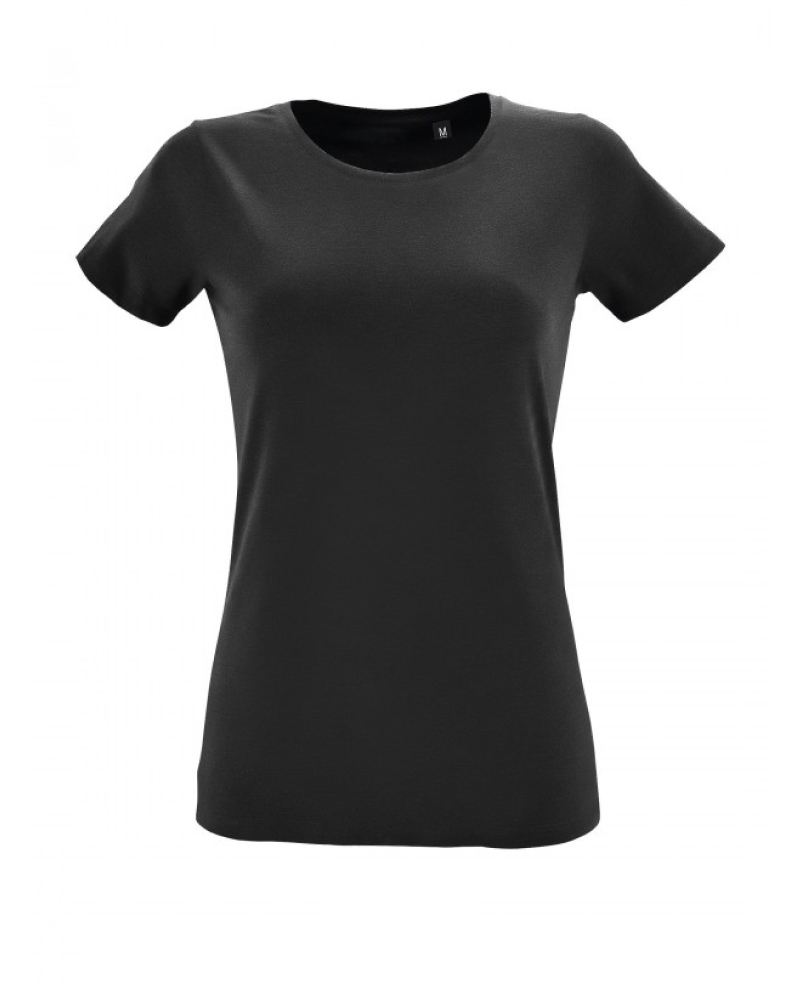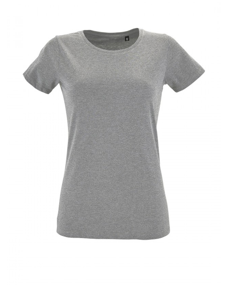 Ženska kratka majica teliranega kroja z okroglim ovratnikom z elastanskim rebrastim robom, kar povečuje elastičnost in prileganje. Material je 100% polčesani ringspun bombaž s težo 150 g/m², kar zagotavlja mehkobo in trpežnost.