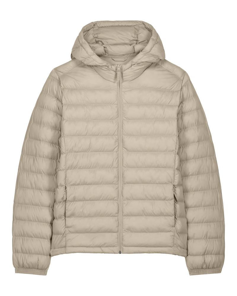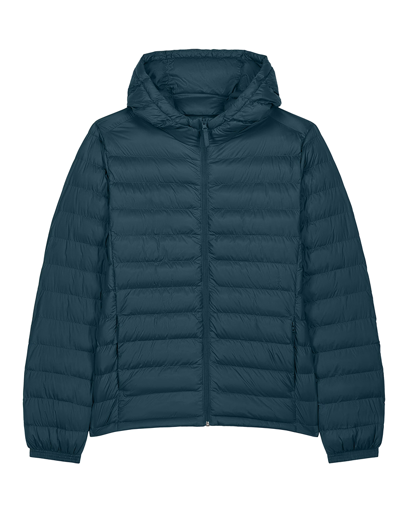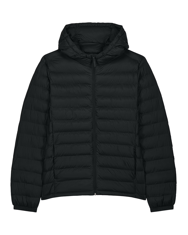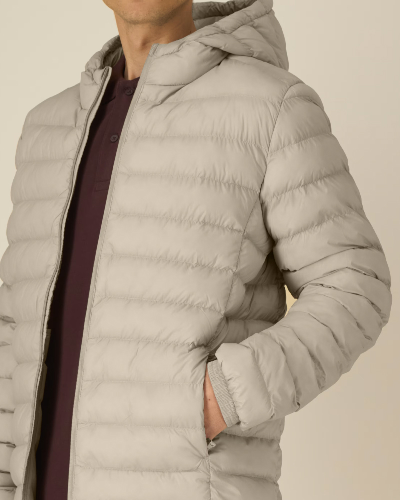 Moška prešita jakna s srednje prilegajočim krojem (Medium Fit), izdelana iz 100% recikliranega najlona z vodoodbojno fluorine-free DWR obdelavo. Lahek 38 GSM material in polno prešit dizajn poskrbita za toploto in športno-eleganten videz. Všit rokav, visok ovratnik z integrirano kapuco, reverzna zadrga ter stranski žepi z grosgrain potegalkami zagotavljajo funkcionalnost in praktičnost. Elastični zaključki na rokavih in nastavljiv spodnji rob z elastično vrvico in stoperjem pa poskrbijo za popolno prileganje. Na voljo v velikostih: S–5XL ✔ Izdelana iz recikliranih materialov ✔ OEKO-TEX® Standard 100 certifikat ✔ PETA-Approved Vegan