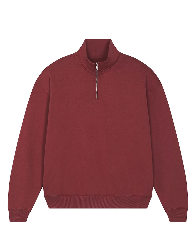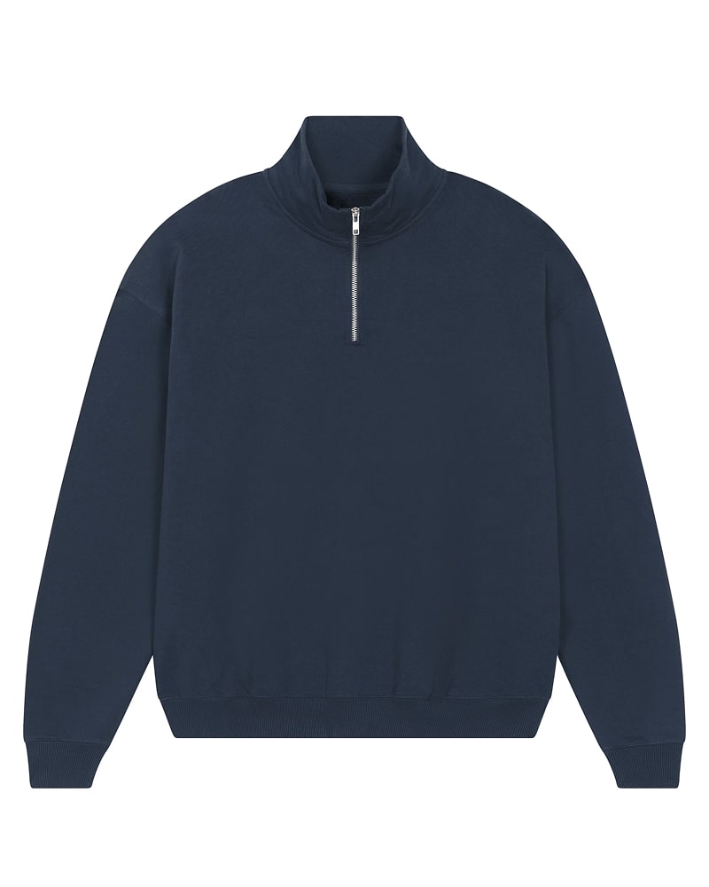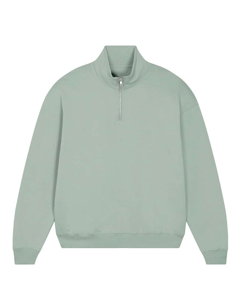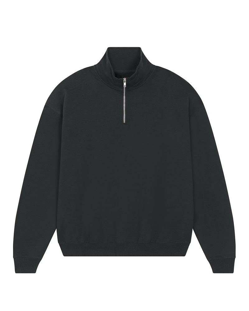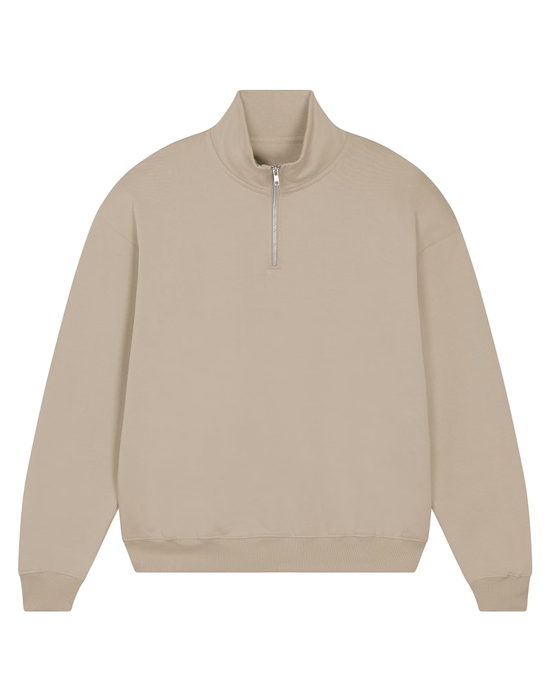 Unisex pulover s četrt zadrge in oversized krojem, izdelan iz debele, 400 GSM tkanine, ki nudi občutek robustnosti in udobja. Izdelan je iz 100 % organskega česanega bombaža French Terry, s posebno “dry hand feel” obdelavo za matiran in prijeten otip. Opremljen je s klasičnimi všitimi rokavi, ovratnikom iz iste tkanine ter herringbone trakom na notranji strani vratu in zadrge za večjo obstojnost. Spredaj ima praktično četrtinsko zadrgo, ki omogoča enostavno oblačenje in regulacijo topline. 2x1 rebrasti zaključki na manšetah in spodnjem robu ter dvonitni šivi na rokavih, manšetah in spodnjem robu zagotavljajo trpežen in eleganten zaključek. Na voljo v velikostih XXS–3XL. ✔ OEKO-TEX® Standard 100 certifikat ✔ PETA-Approved Vegan