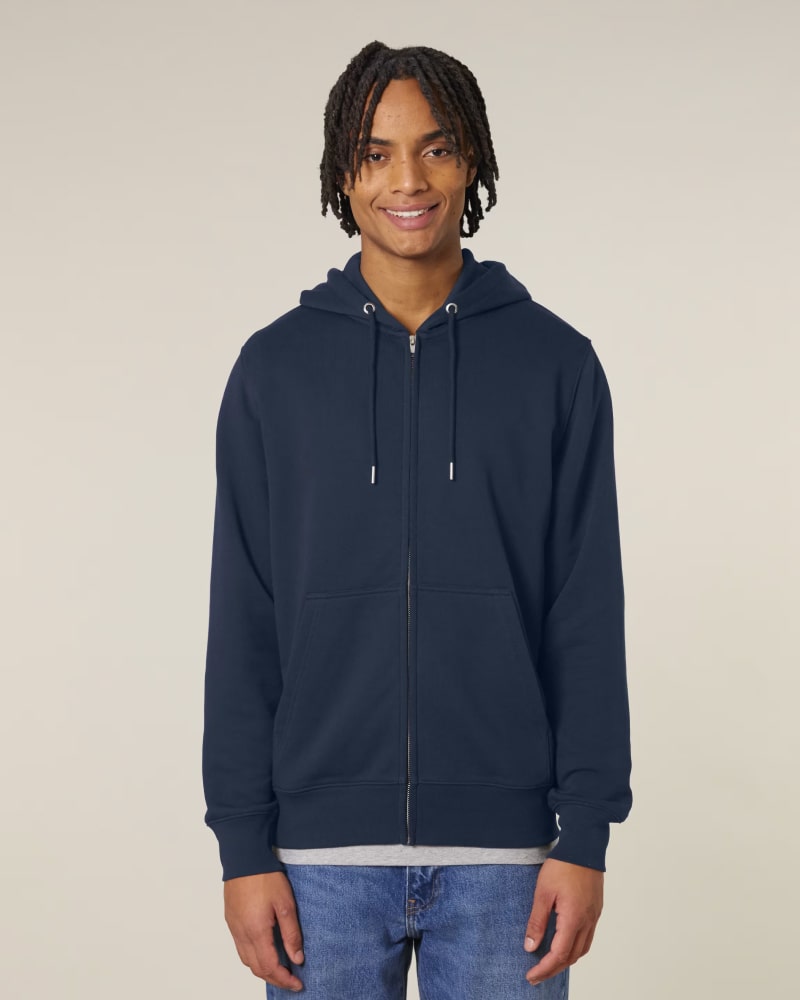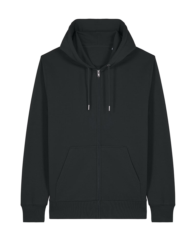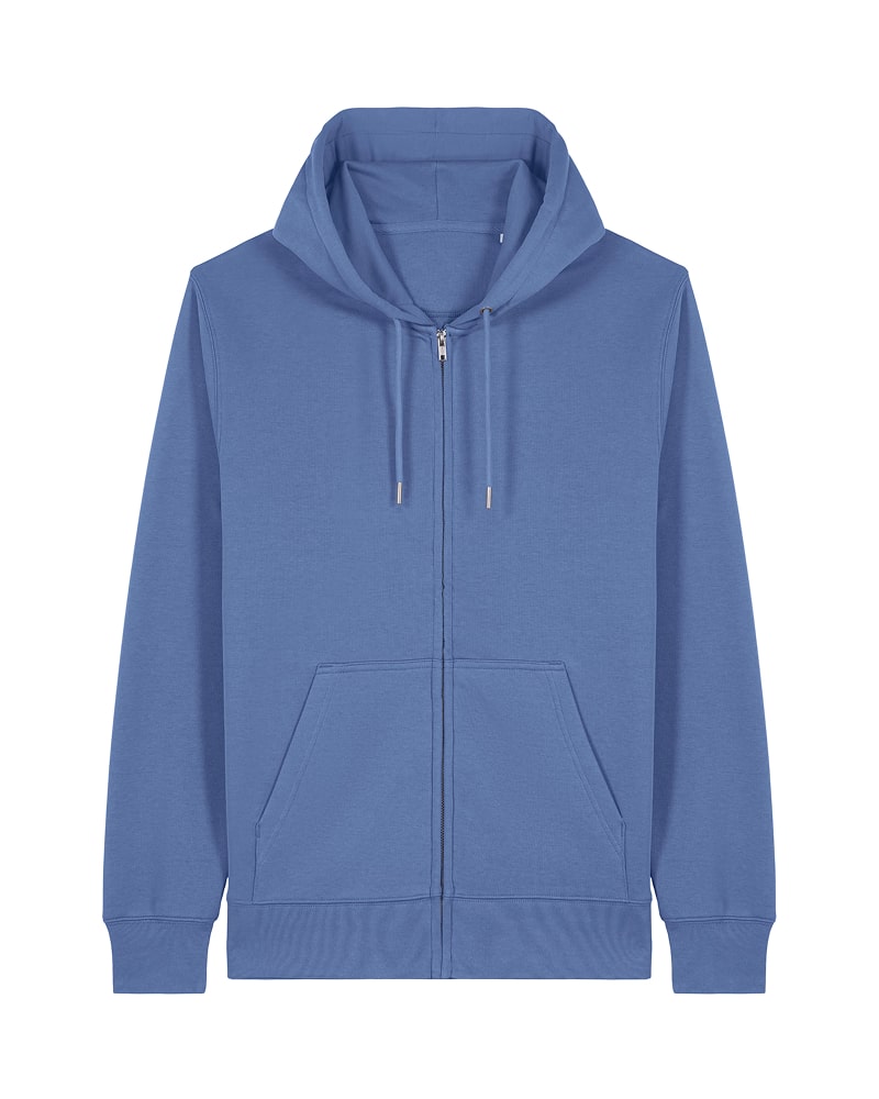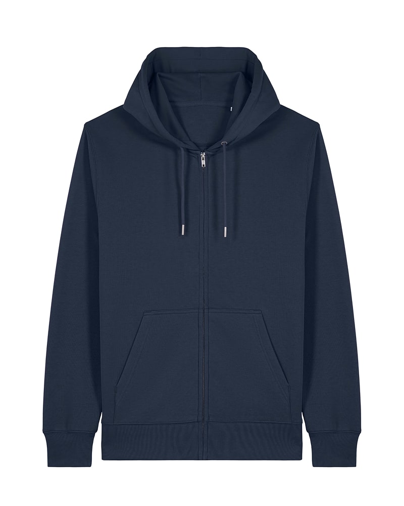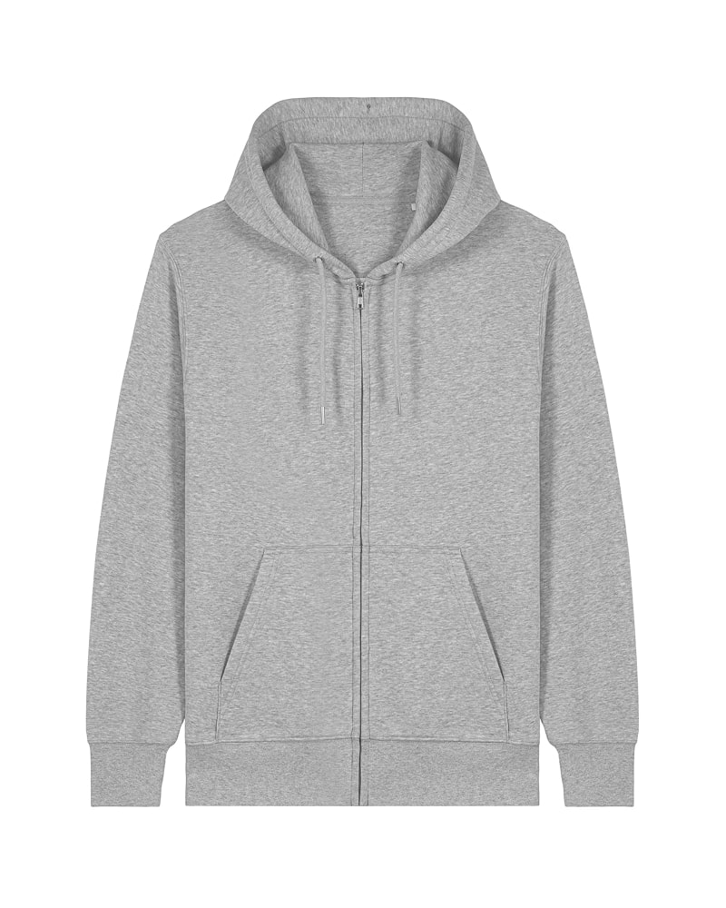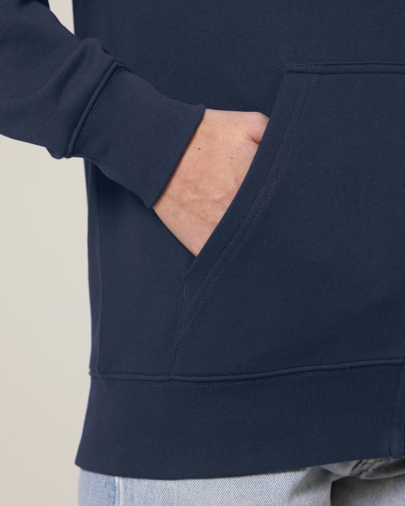 Pulover s kapuco in srednje prilegajočim krojem, izdelan iz 300 GSM tkanine za optimalno udobje in mehkobo. Izdelan je iz French Terry, 85 % organskega česanega bombaža ring-spun in 15 % recikliranega poliestra, predhodno opranega za mehkejši in prijeten finiš. Opremljen je s klasičnimi všitimi rokavi in kapuco podloženo z enako tkanino, spredaj pa se nahaja pokrita kovinska zadrga za enostavno oblačenje. Okrogle vrvice v barvi oblačila z zaprtimi kovinskimi konicami in všiti kovinski obročki dodajajo funkcionalnost in eleganten detajl. Pulover vključuje praktičen kangaroo žep za shranjevanje ali ogrevanje rok. 1x1 rebrasti zaključki na manšetah in spodnjem robu ter dvonitni šivi na rokavih, manšetah in spodnjem robu zagotavljajo trpežen in eleganten videz. Herringbone trak na notranji strani zadnjega dela vratu in zadrge ter polmesečna vstavka iz iste tkanine na zadnjem delu vratu zagotavljajo dodatno obstojnost in udobje. Na voljo v velikostih XXS–3XL. ✔ OEKO-TEX® Standard 100 certifikat ✔ PETA-Approved Vegan
