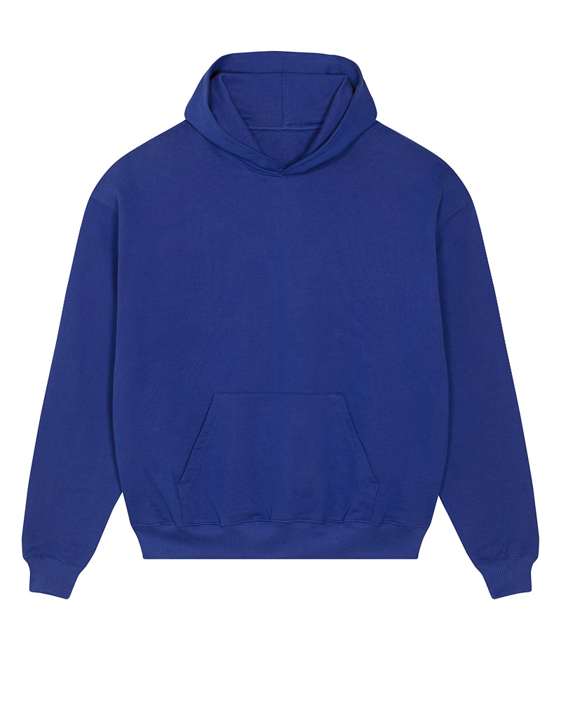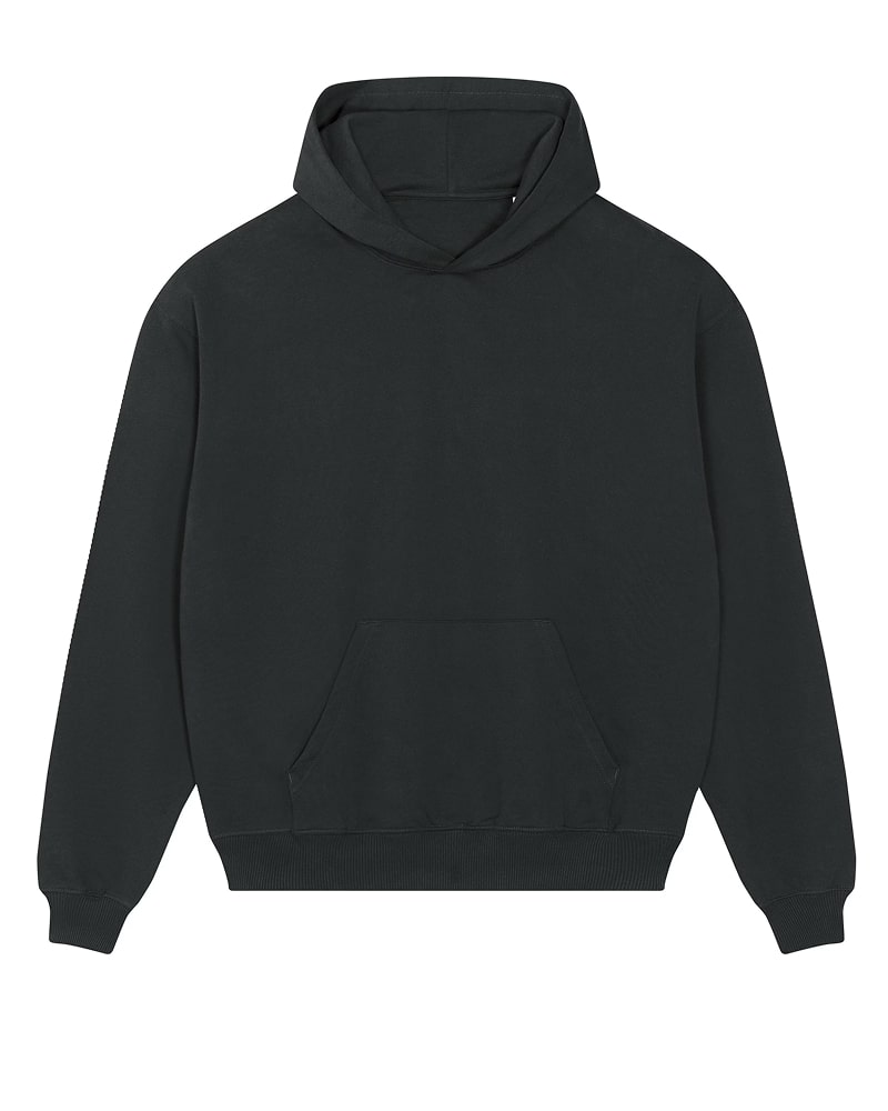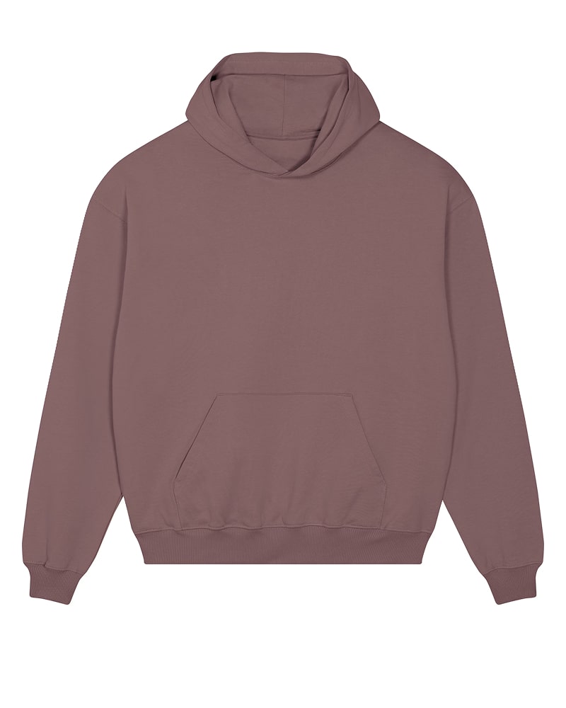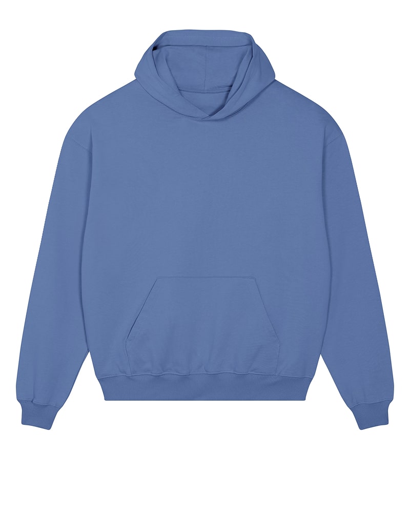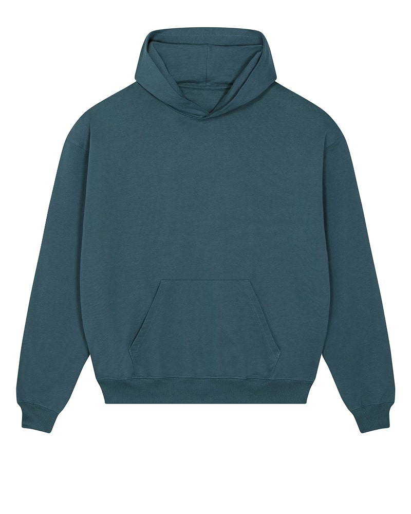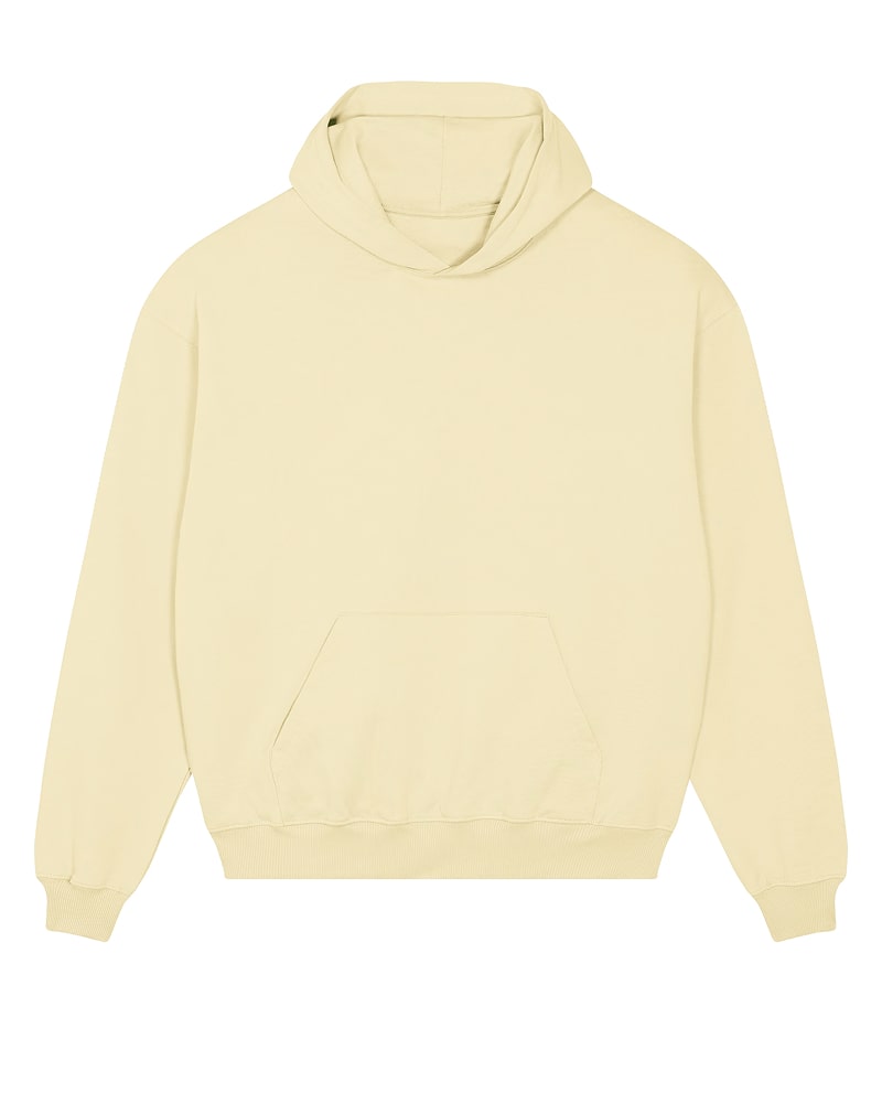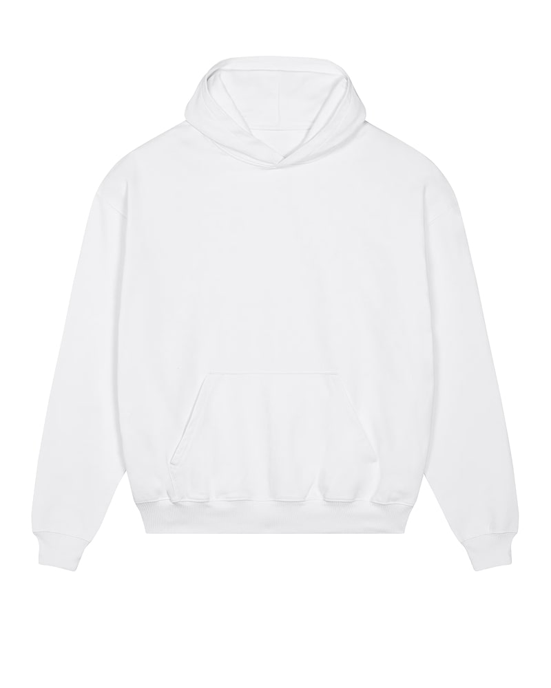 Unisex pulover s kapuco in oversized krojem, izdelan iz debele, 400 GSM tkanine, ki nudi robustno udobje in prijeten občutek na dotik. Izdelan je iz 100 % organskega česanega bombaža French Terry, s posebno “dry hand feel” obdelavo za matiran, naraven otip. Opremljen je s klasičnimi všitimi rokavi, dvojno slojno kapuco iz iste tkanine, notranjim single jersey trakom na zadnjem delu vratu ter polmesečno vstavko iz iste tkanine za dodatno obstojnost in udobje. Enonitni šivi na izrezu in ob odprtini kapuce, 2x1 rebrasti zaključki na manšetah in spodnjem robu ter dvonitni šivi na rokavih, manšetah in spodnjem robu zagotavljajo trpežen in eleganten videz. Spredaj ima praktičen kangaroo žep za shranjevanje ali ogrevanje rok. Na voljo v velikostih XXS–3XL. ✔ OEKO-TEX® Standard 100 certifikat ✔ PETA-Approved Vegan