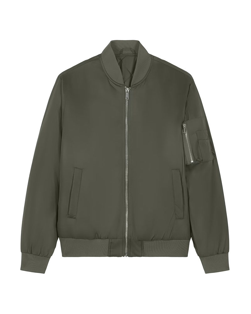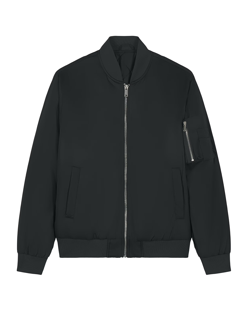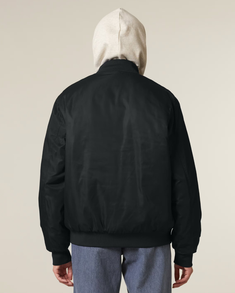 Unisex bomber jakna s srednje prilegajočim krojem (Medium Fit) in težo 240 GSM združuje urbano estetiko in trajnostne materiale. Lupina iz 100 % recikliranega poliestra s fluor-free DWR obdelavo nudi zaščito pred vetrom in dežjem, notranja polna prešita podloga in reciklirano polnilo pa skrbita za toploto. Prepoznavni bomber detajli: srebrna kovinska zadrga na sprednji strani, rebrasti zaključki na rokavih, spodnjem robu in ovratniku, žep na rokavu s štirimi reži za pisala ter sprednja žepa z gumbi za zapiranje. Notranjost dopolnjuje prsni žep z gumbom. Na voljo v velikostih: XXS–3XL. ✔ OEKO-TEX® Standard 100 certifikat ✔ PETA-Approved Vegan