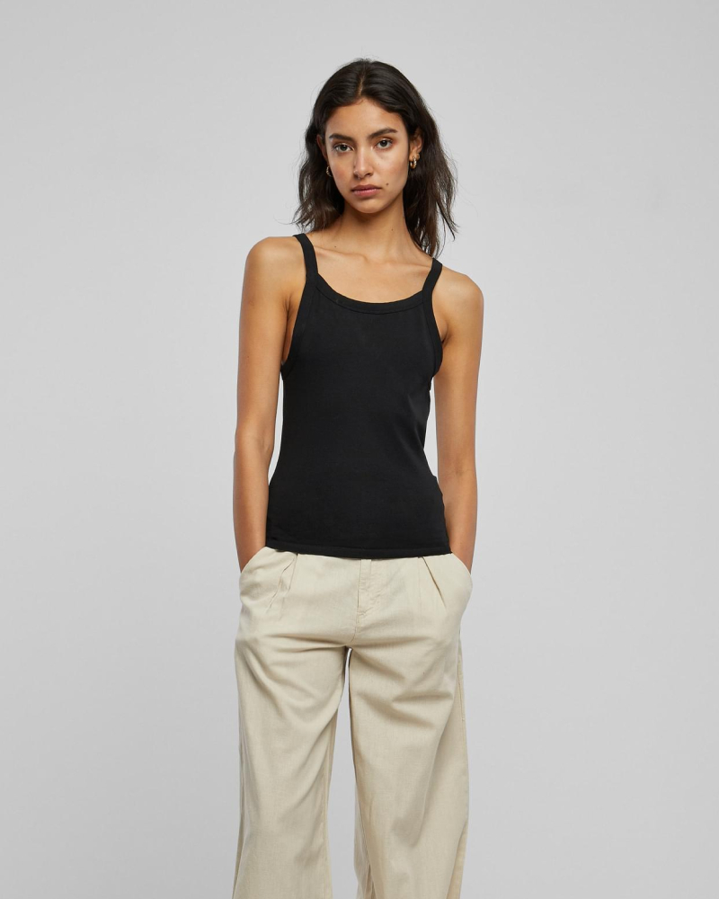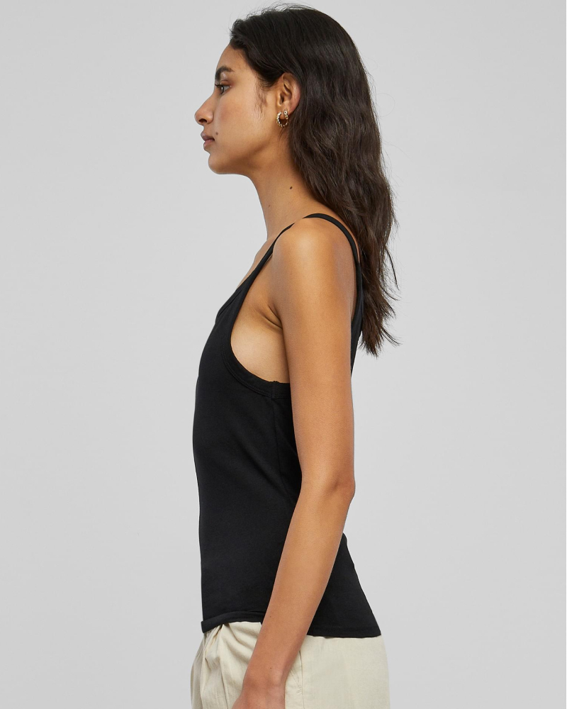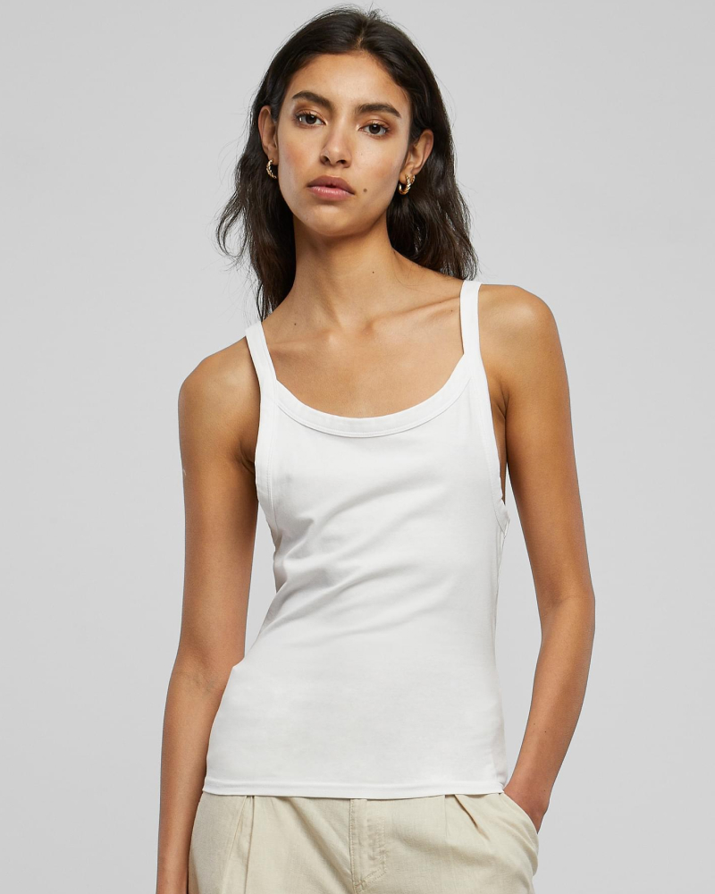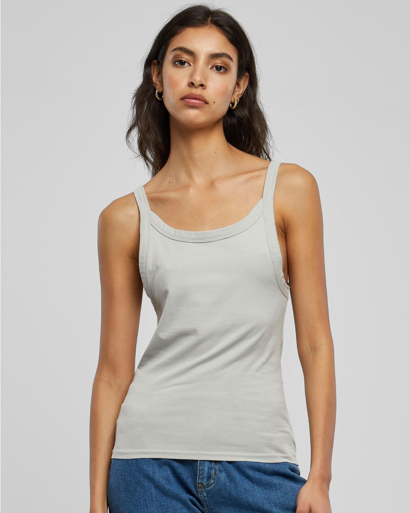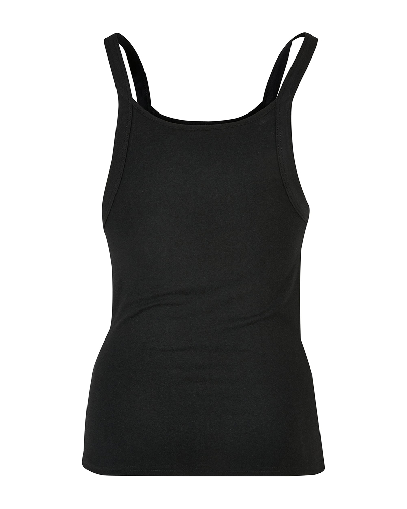 Ta ženski tank top združuje urbani videz z globokimi izrezi pri rokavih in oprijetim krojem, ki lepo objame postavo. Široke naramnice se elegantno povežejo z globokima izrezoma spredaj in zadaj, kar ustvarja športno-poletni videz. Izdelan je iz prijetne mešanice 95 % bombaža in 5 % elastana (180 g/m²), kar omogoča udobno, prožno prileganje ter ohranja obliko tudi po več pranjih.