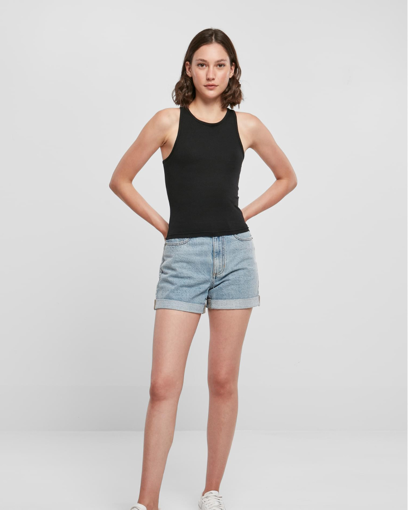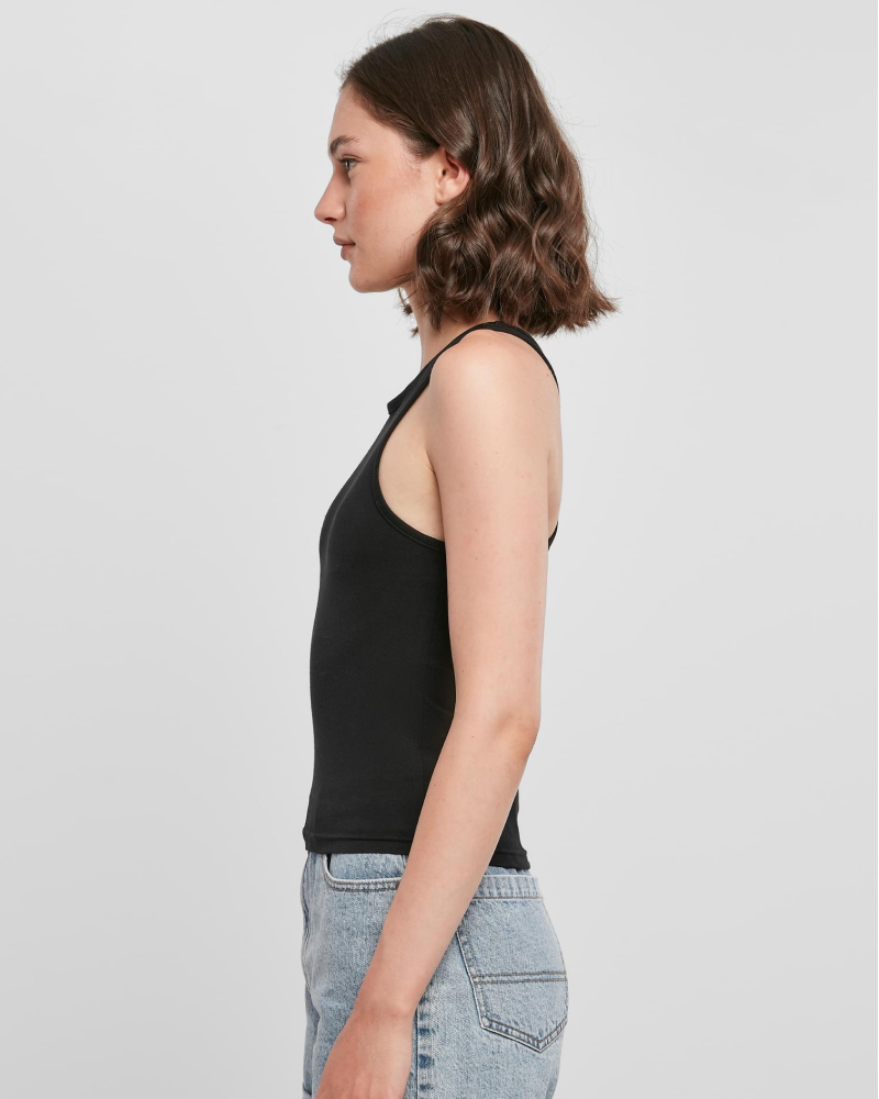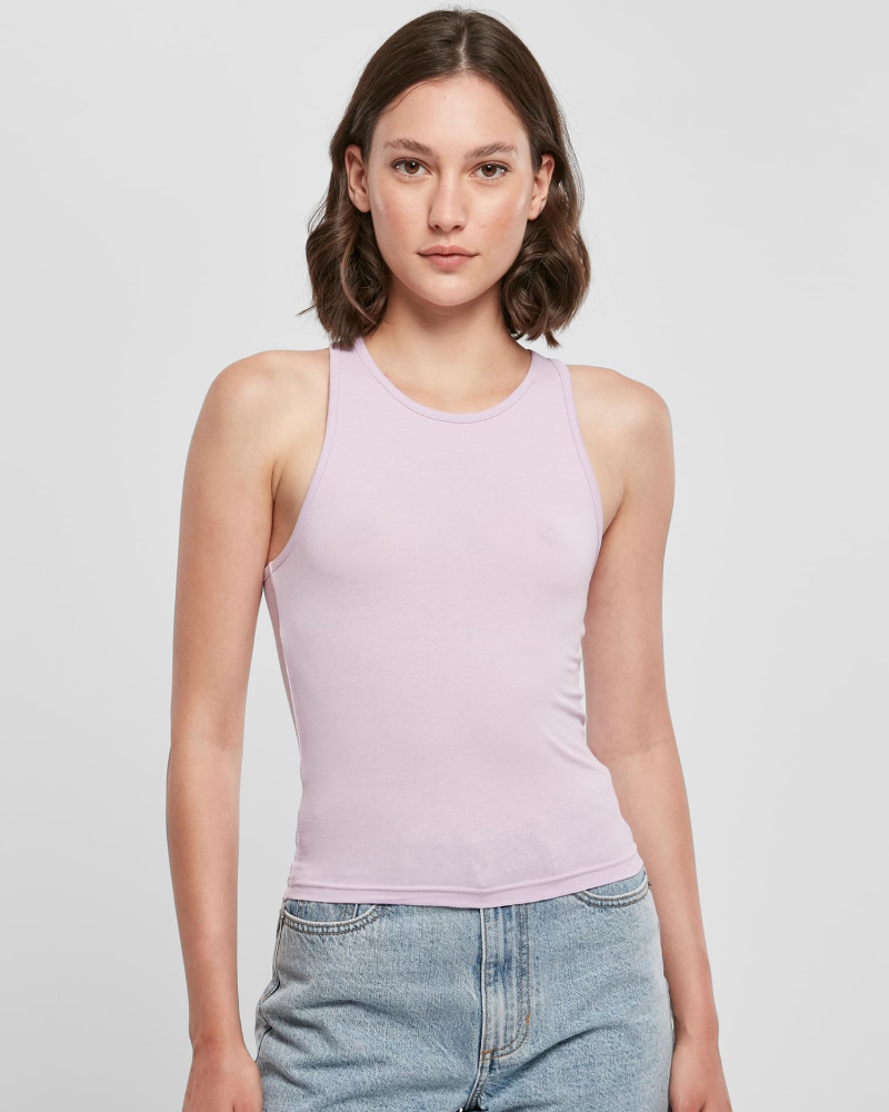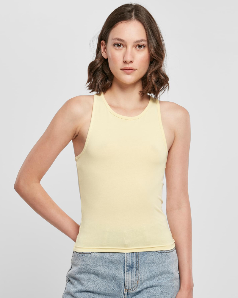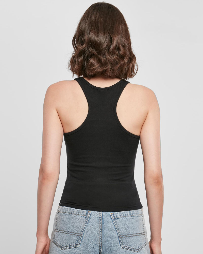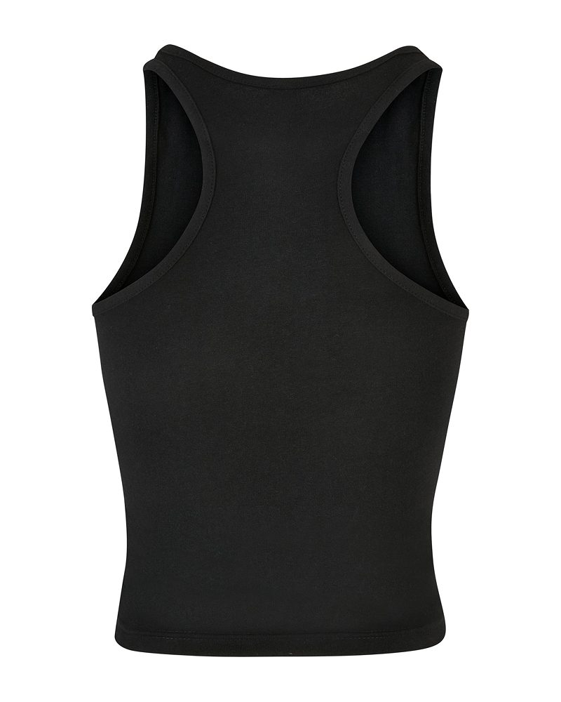 Ta dinamičen ženski top s športnim krojem "racerback" prinaša stilsko izjavo v minimalistični, enobarvni zasnovi. Spredaj ga dopolnjuje visok okrogel izrez, oprijet kroj in krajša dolžina pa ustvarjajo sodoben, ženstven videz. Za udobno nošenje skrbi prijetna mešanica materialov – 95 % bombaž in 5 % elastan (180 g/m²) –, ki omogoča prožno in mehko prileganje.